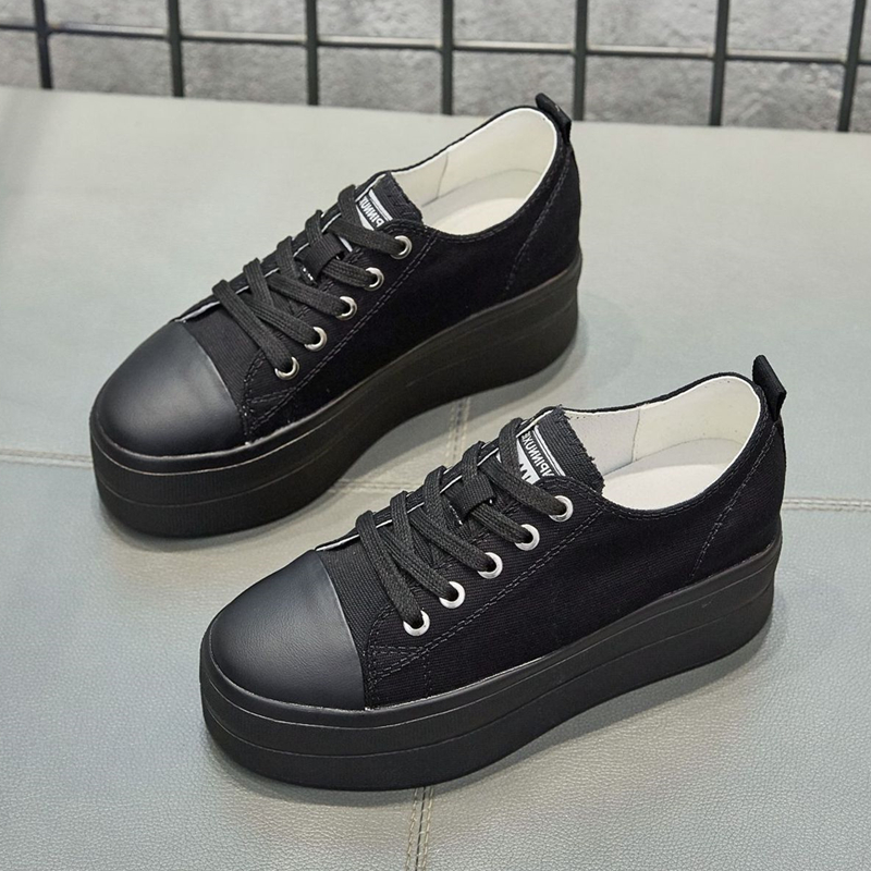 Korean Style Height Increasing 8cm Low black canvas pumps womens