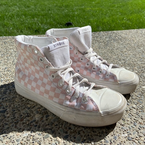 pink checkered high top vans
