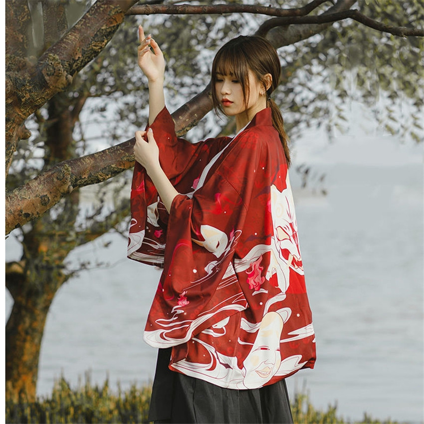 Traditional Yukata Japanese Style Woman red kimono cardigan
