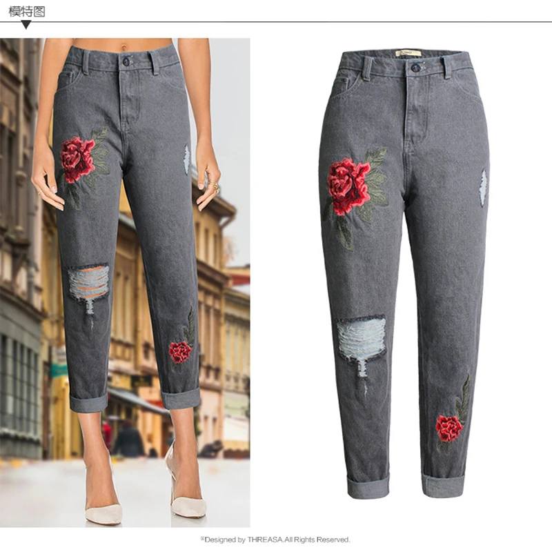 Embroidery Denim Jeans For Women Mom dark grey baggy jeans