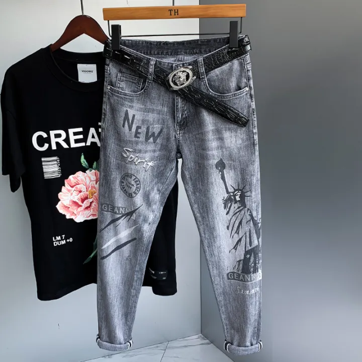 Summer Thin Gray Printing Ripped Jeans ripped tapered jeans mens