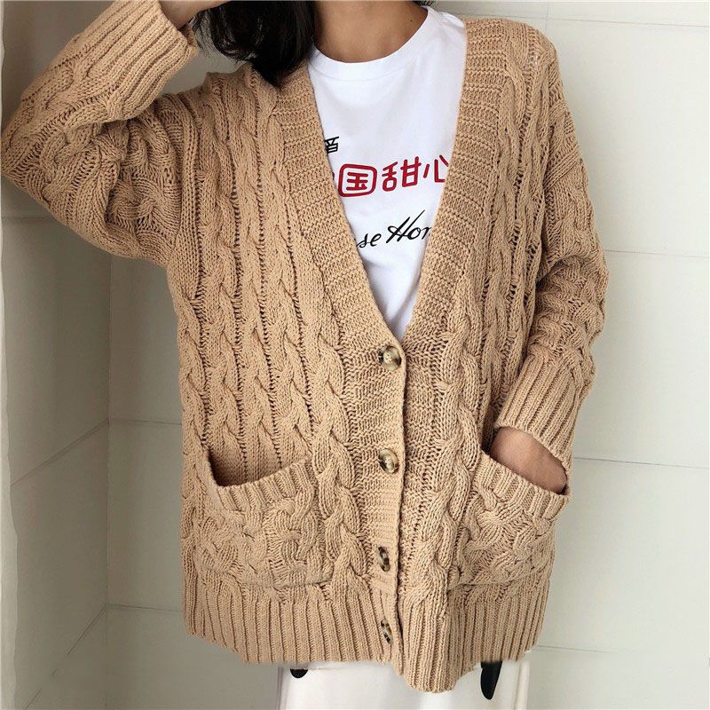 2021 Camel Color Cable Knits V Neck long camel colored cardigan