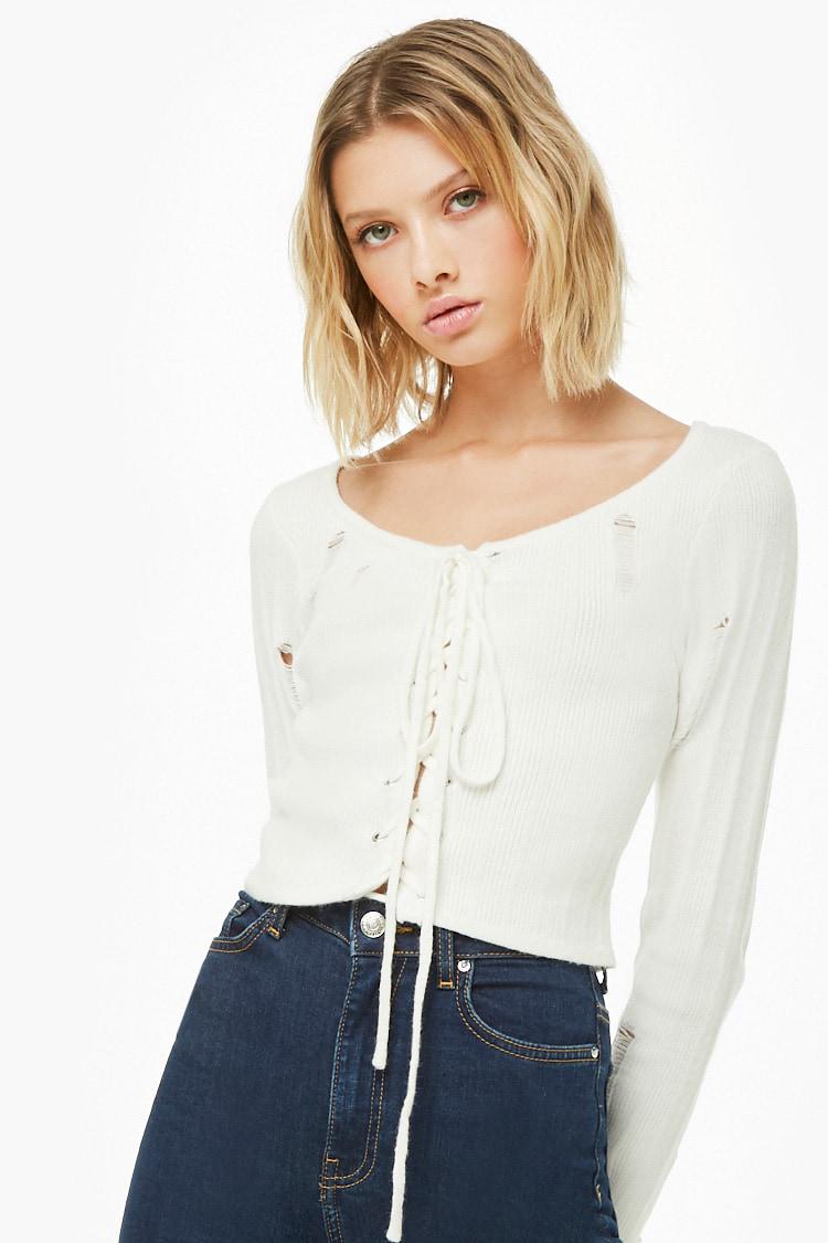 Forever 21 Synthetic Distressed Lace-up lace up cardigan
