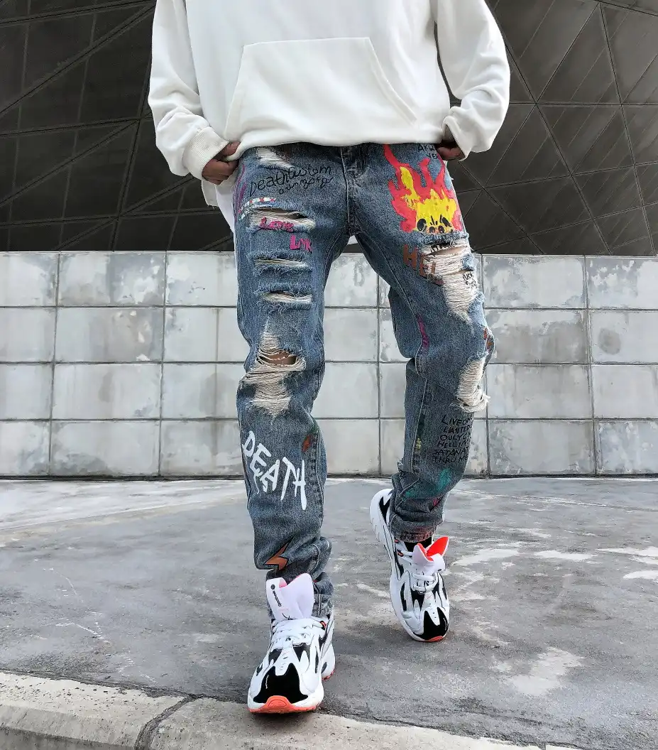 Graffiti Hole Hip hop Baggy Denim Jeans jeans with black flames on the bottom