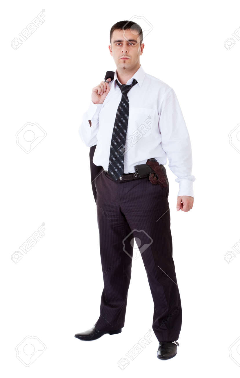 Young Man In Black Suit With Gun On black suit belt
